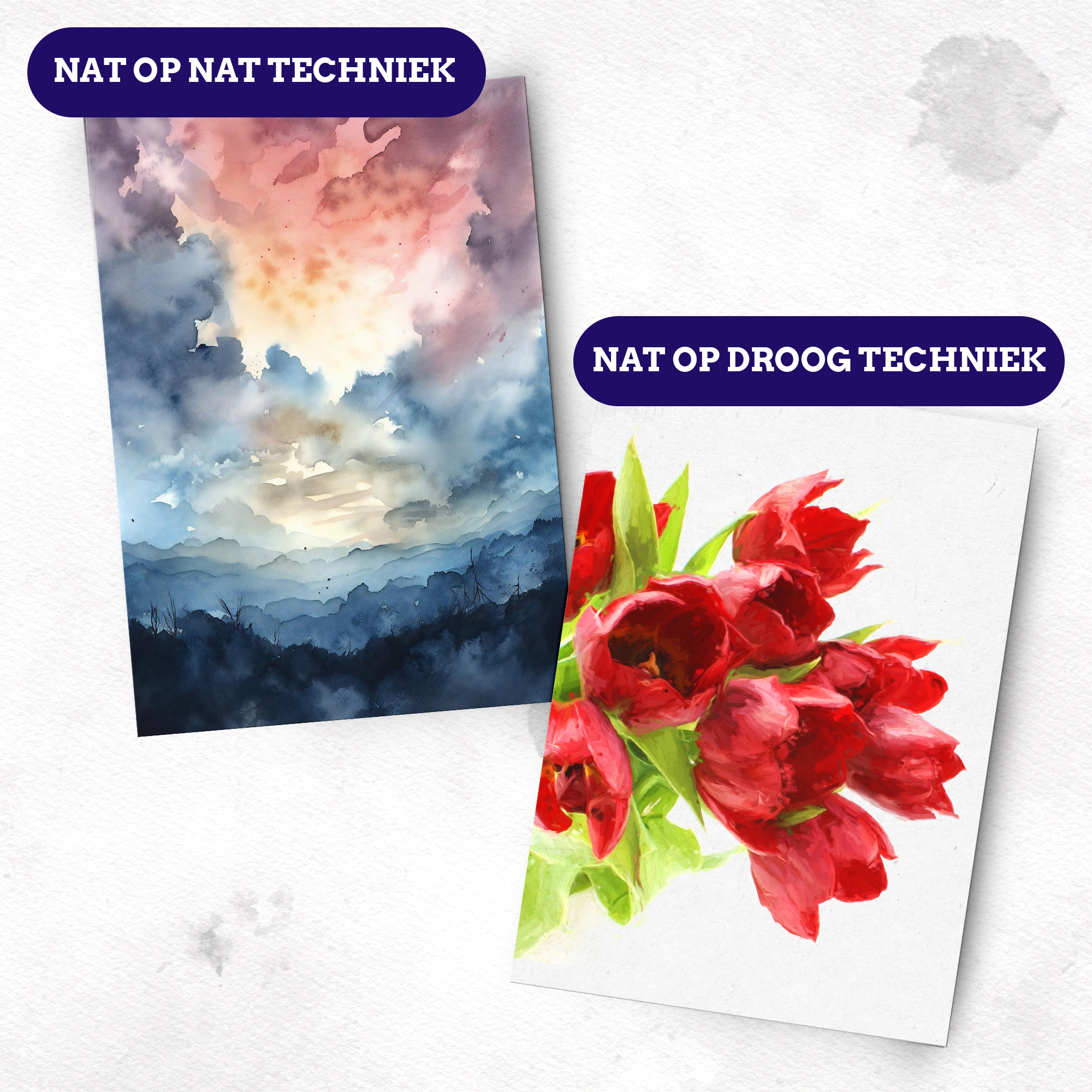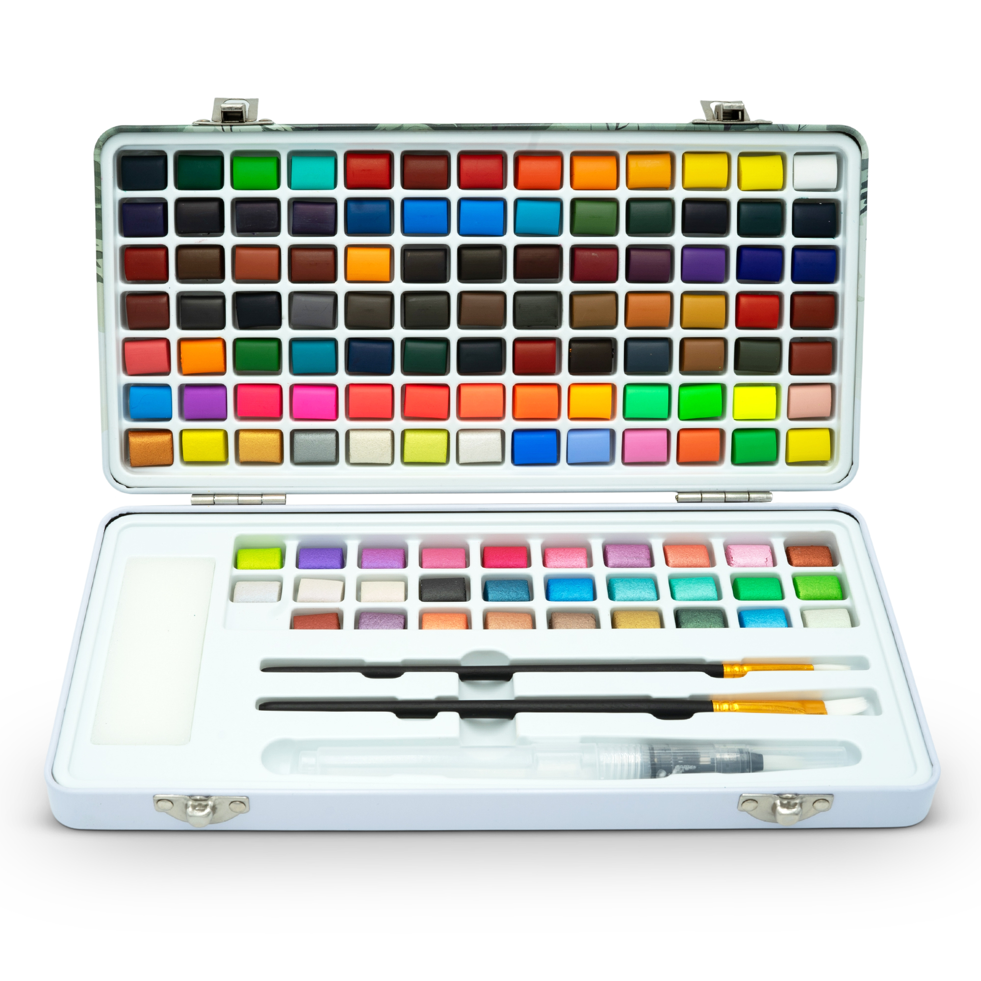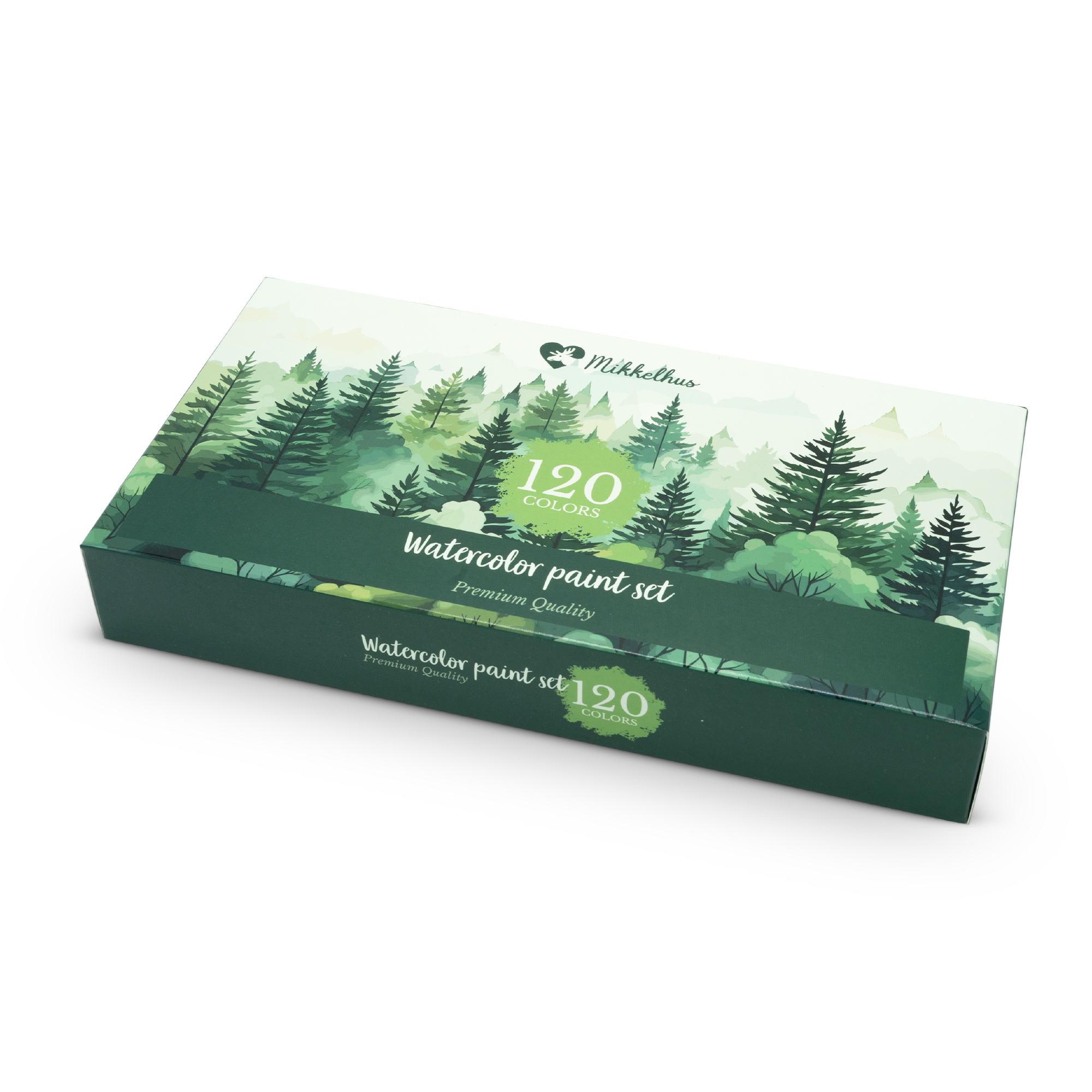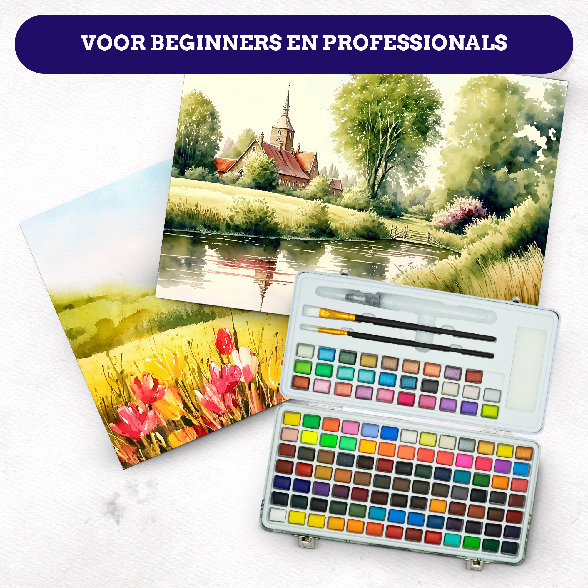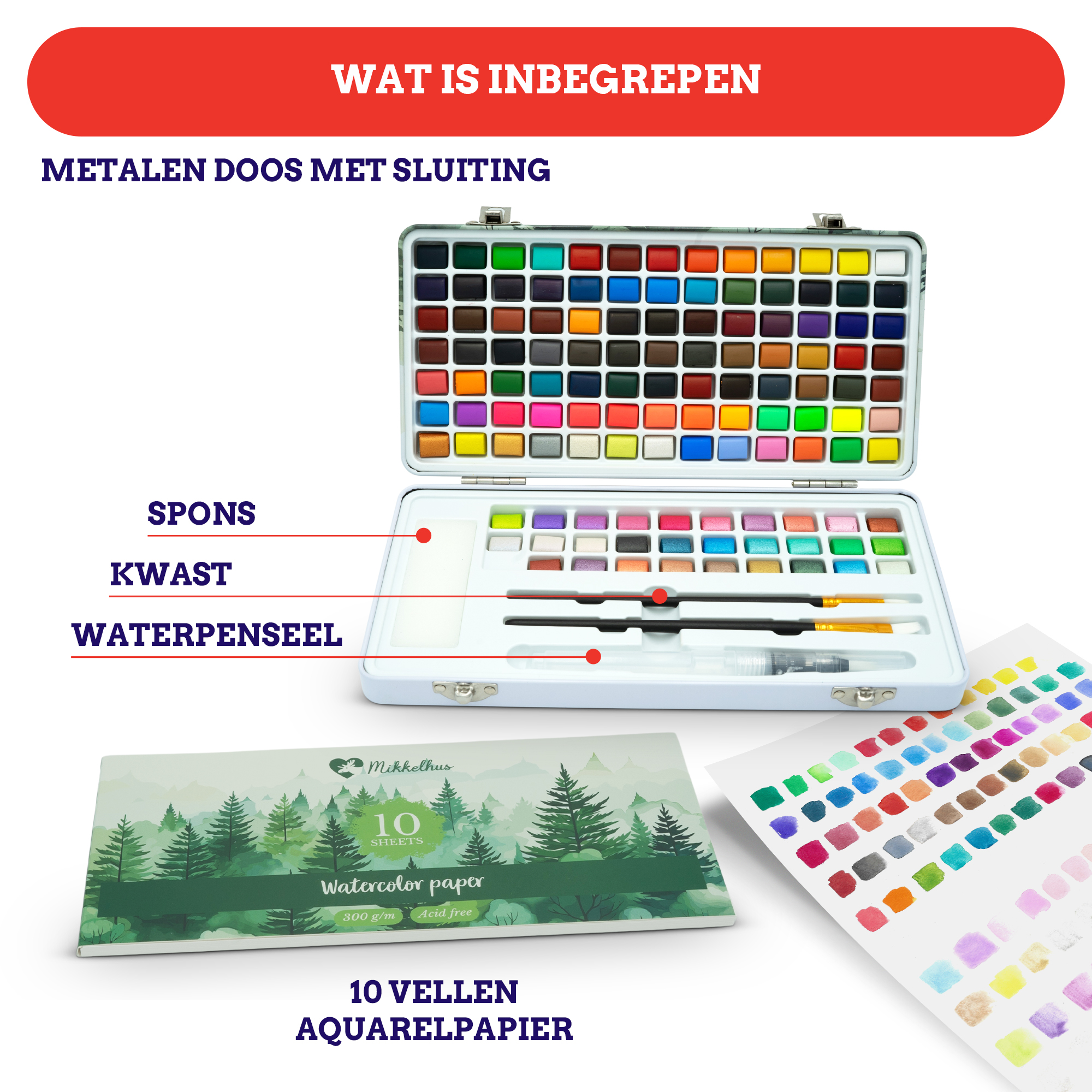 Mikkelhus Professionele Aquarelverf Set | Verfset met 120 diverse kleuren aquarelverf, papier, waterpenseel, kwasten en spons