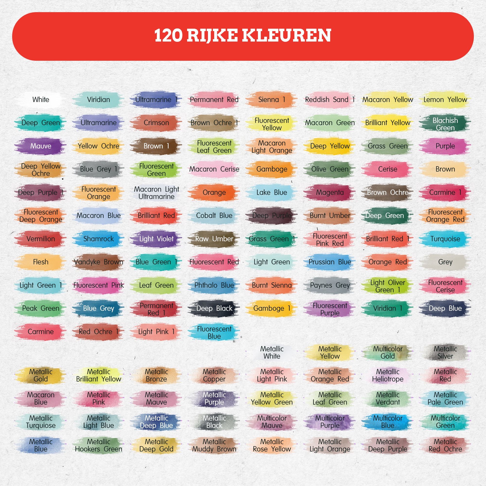 Laat je creativiteit de vrije loop met aquarelverf. Deze diverse set bevat 120 uiteenlopende kleuren waaronder 6 fluorescerende en 12 metallic tinten. Zo kun je onbeperkt variëren en moeiteloos al je unieke creaties en kunstwerken tot leven brengen. De mogelijkheden zijn eindeloos!